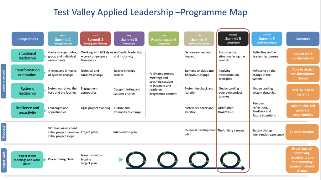 The programme was designed as a connected learning journey that combined large-group summits, project work, and individual and team-based support. It began with a whole-group leadership summit bringing together the full senior management forum to establish the objectives of the programme and to create a compelling shared narrative about becoming a more effective community council. Participants were then supported to identify and shape a set of system and place-based challenges that would help deliver the outcomes the council wanted to see. These projects were explicitly future-facing, providing a practical vehicle for participants to apply new ideas, test approaches and learn through doing. These groups explored themes including digital transformation, ways of working, place-based working, supporting young people, and local government reorganisation, using a shared framework to map where the organisation was starting from, where it aspired to be, and the leadership journey required to move between the two.